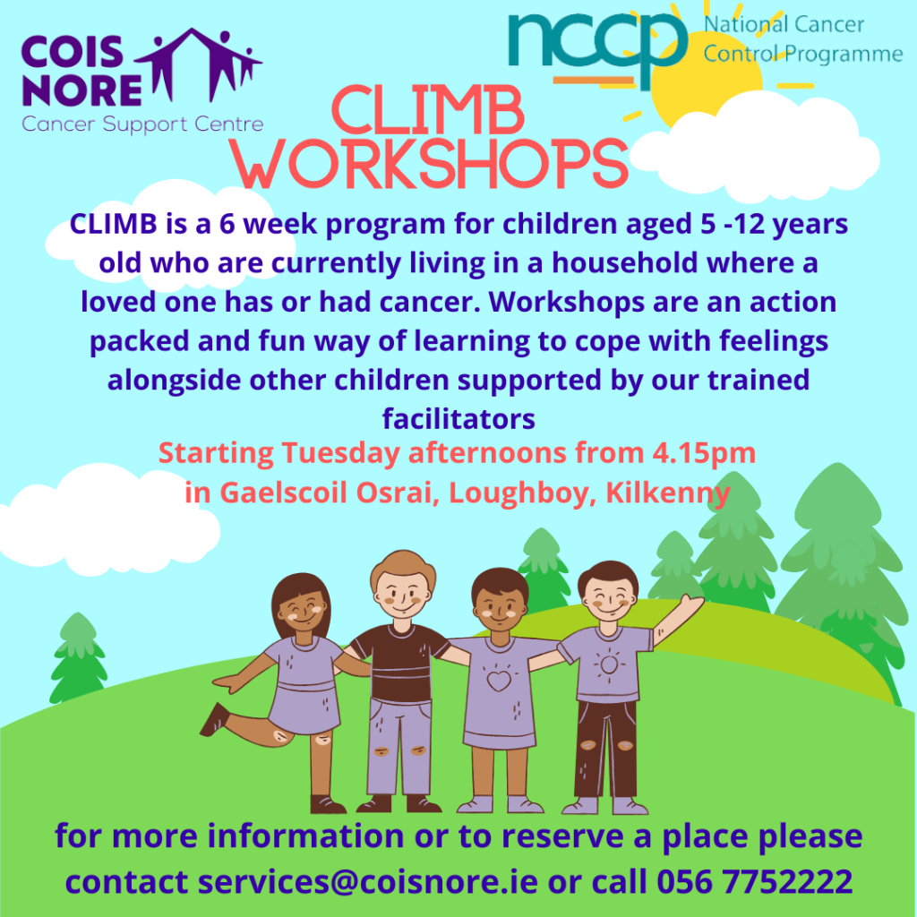 A six week programme for Primary School aged children who have a parent who has or had cancer, CLIMB supports children through art and play to express and regulate their emotions. Next programme starting on Tuesday 14th April. For more information or to book a space contact Mary Kate on 056 7752222 or email [email protected]