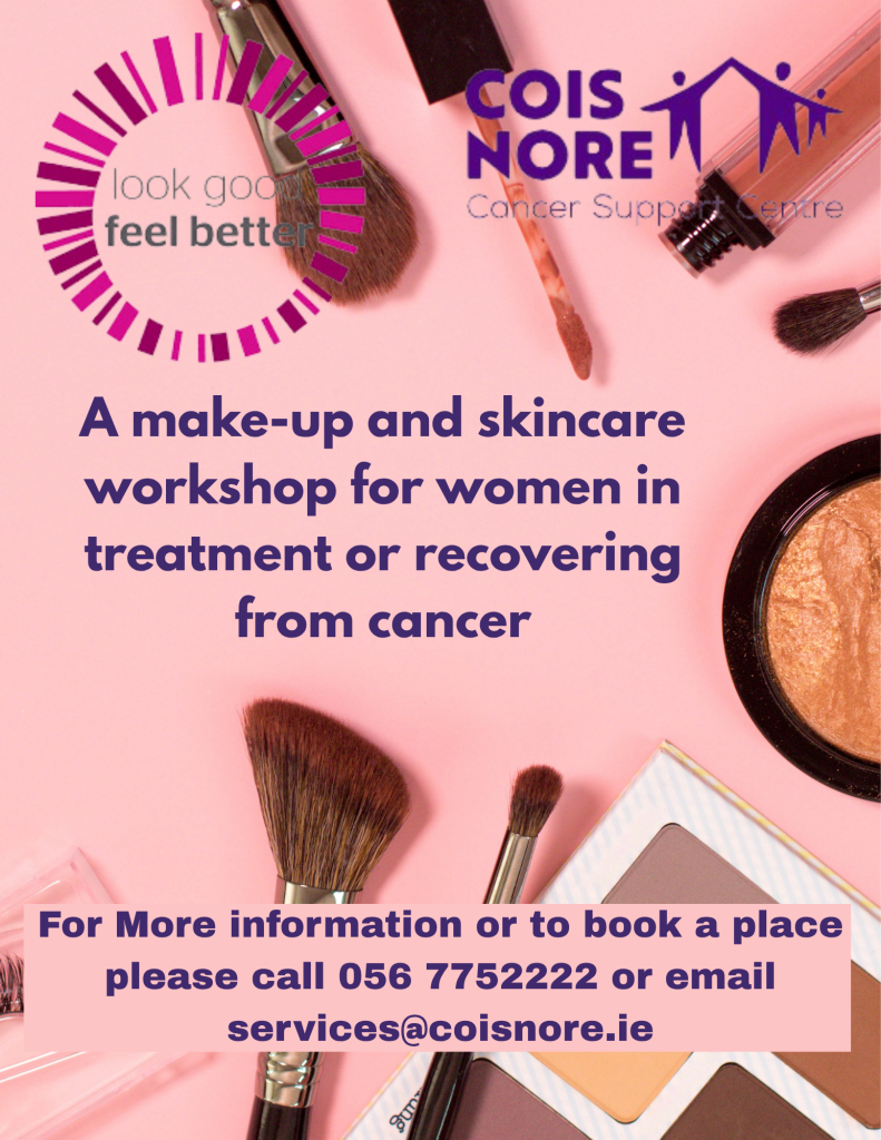 We have spaces available for our Look Good Feel Better skincare and make-up workshops after Easter. The workshops take place in Cois Nore from 11am to 1pm. Come and enjoy an morning of fun and pampering and get a lovely goodie bag to take away. To book a place call 056 7752222 or email [email protected]